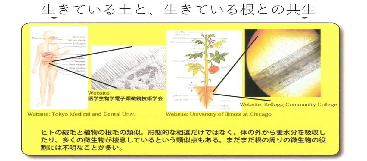 39話で詳しくお話をさせていただいたように、オーガニックの理念である「土が生きている」という考え方は、まさしくこの根の表面から約5mmの範囲にある、いわゆる根圏といわれる特別な生命環境に現れている。天文学的な数の微生物がこの生活圏で生きた根と共生し、様々な相互共生(代謝・呼吸)により、お互いの生命を維持成長させていくという、生命の本質の営みがある。この生活圏において、植物の根は、自身の生命活動に必要な微生物を育て、その活動を促進させるために、微生物のエサとなるような様々な物質を供給している。また、この微生物との共生関係は、単なる微生物のエサというだけではなく、植物の免疫活性にも役立っている。