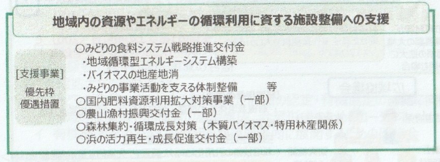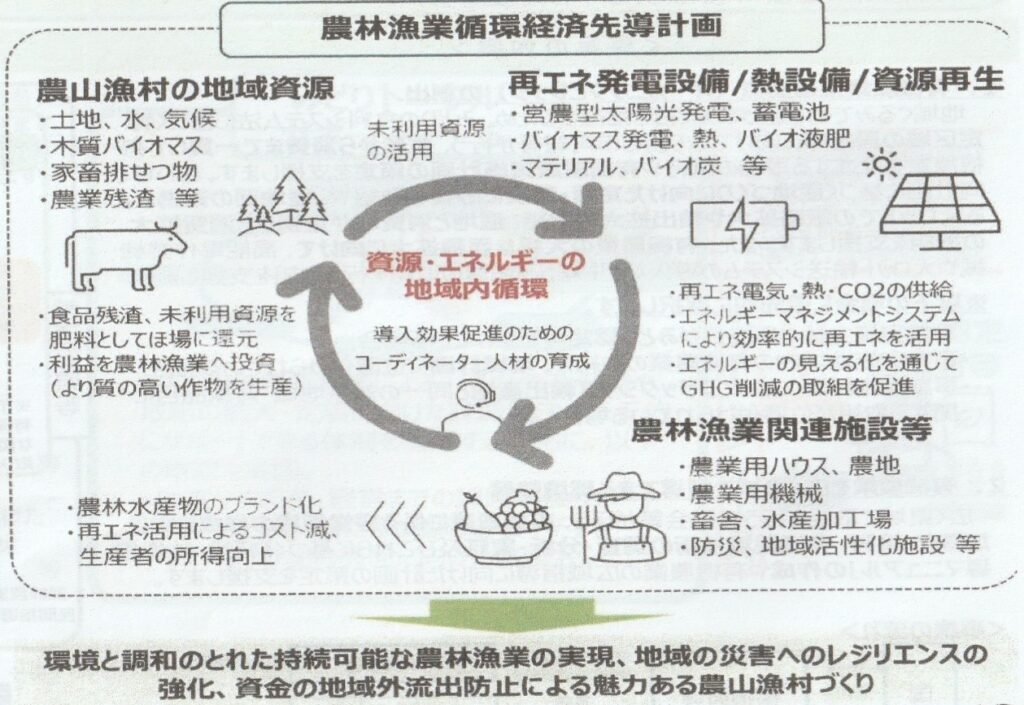・地域の資源・再生可能エネルギーを地域の農林漁業で循環利用する包括的な計画を策定した市町村(農林漁業循環経済先導地域)において、農林漁業を核とした、循環経済の取り組みを支援します。
